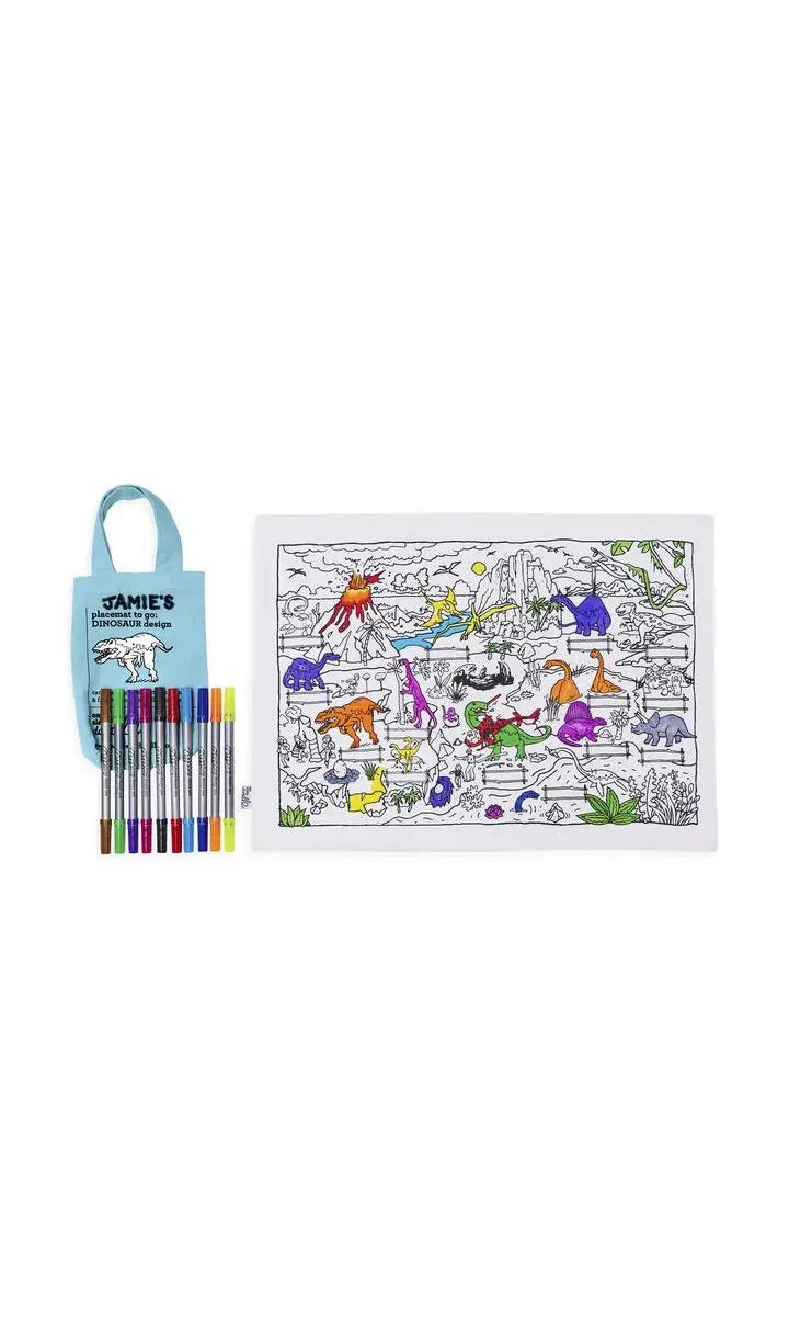 This fun color-in placemat comes in its own mini tote bag complete with ten colorful wash-out markers. Kids can learn about the dinosaurs as they color in this cool placemat featuring our color-in dinosaur drawing on one side and a notepad print on the other. Whenever they're ready, wash the placemat on a warm machine cycle, the ink completely disappears, and it's ready to be re-colored and re-discovered - makes the best gift for dinosaur lovers! Product size: 18in x 13in. Fabric: 100% cotton. Pack weight: 7.9oz. Care: wash warm/40°, dry naturally.