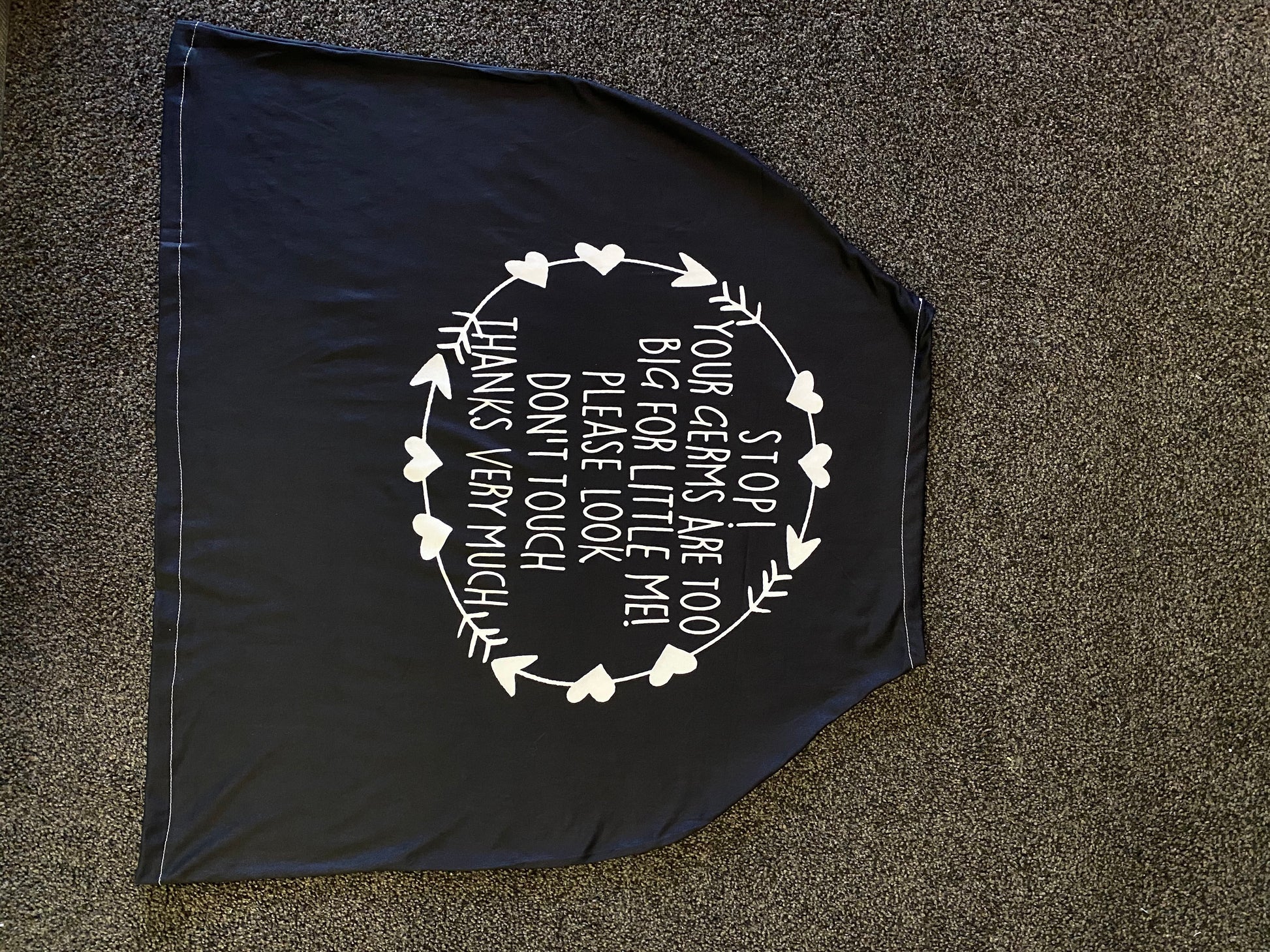 Thin and light multi use cover. Car seat, nursing, shopping cart, stroller, or high chair featuring a gentle reminder:)