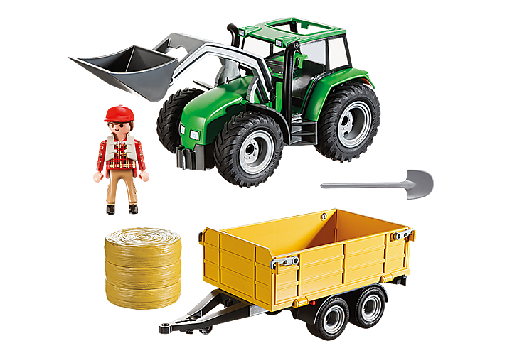 Figures:1 Farmer; Accessories: 1 tractor, 1 trailer, 1 hay bale, 1 shovel