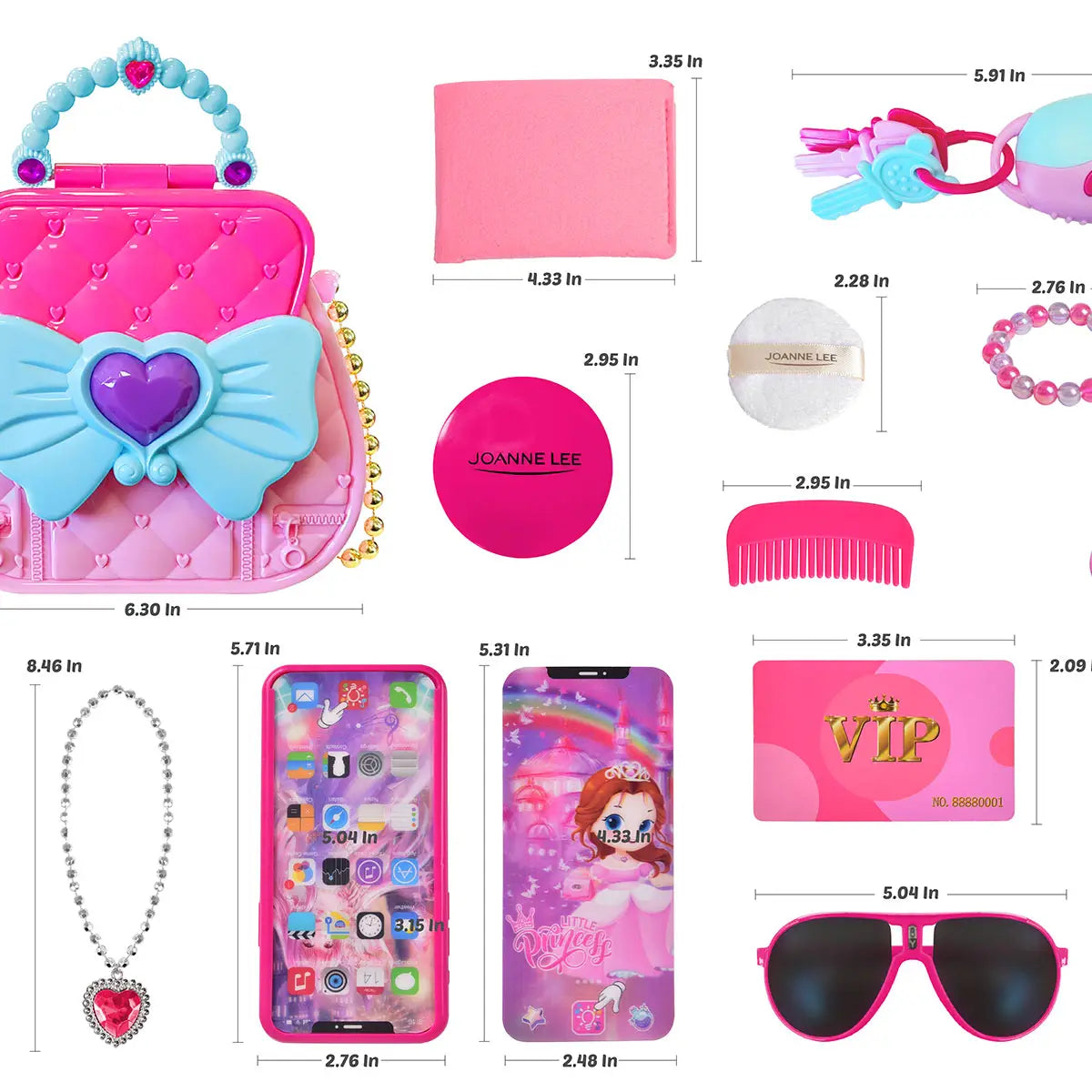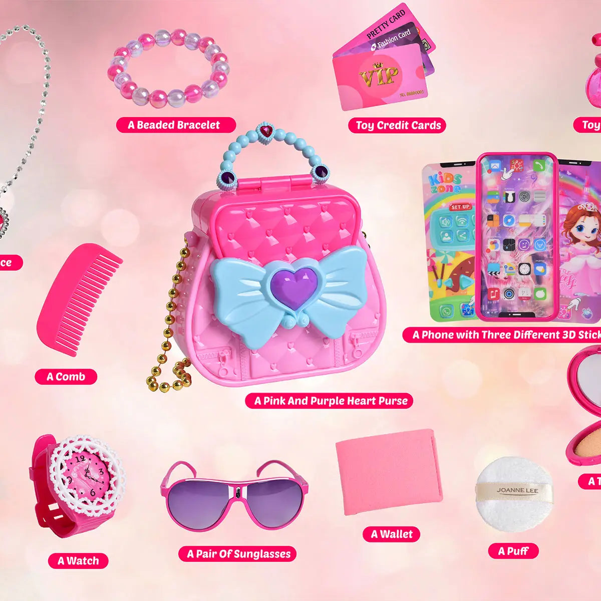 This kids purse includes: 1* necklace, 1* beaded bracelet, 1* Pink and Purple Heart purse, 1* comb, 1* lipstick, 1* watch, 1* pair of sunglasses, 1* wallet, 1* puff, 1* toy foundation, toy phone with three different Home Screen 3D stickers, Toy credit cards and a Toy perfume. This girl's makeup set has everything a girl needs! This kids' makeup kit for girls is made from durable and long-lasting plastic. Safe and non-toxic. Certified by US Toy Safety Standard ASTM-F963 CPSIA. This cosmetic bag is an ideal kids toy that every girl would want to have! These stylish princess playsets can make girls' dreams come true! You can dress up like a princess and go shopping using credit cards. Wear your perfume and lipstick, take your purse, and put sunglasses on - also don’t forget your watch, necklaces, and bracelets! The smartphone included in the kids' makeup kit has three different naked eye 3D desktop wallpapers.