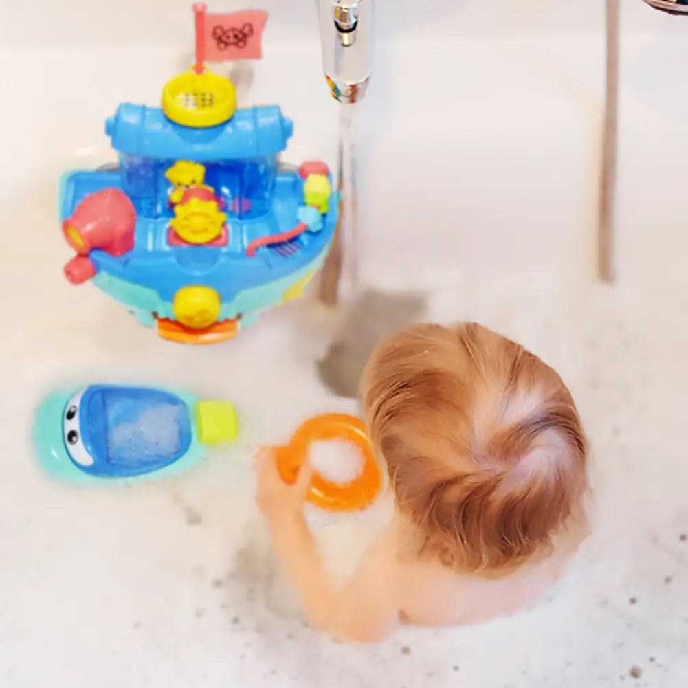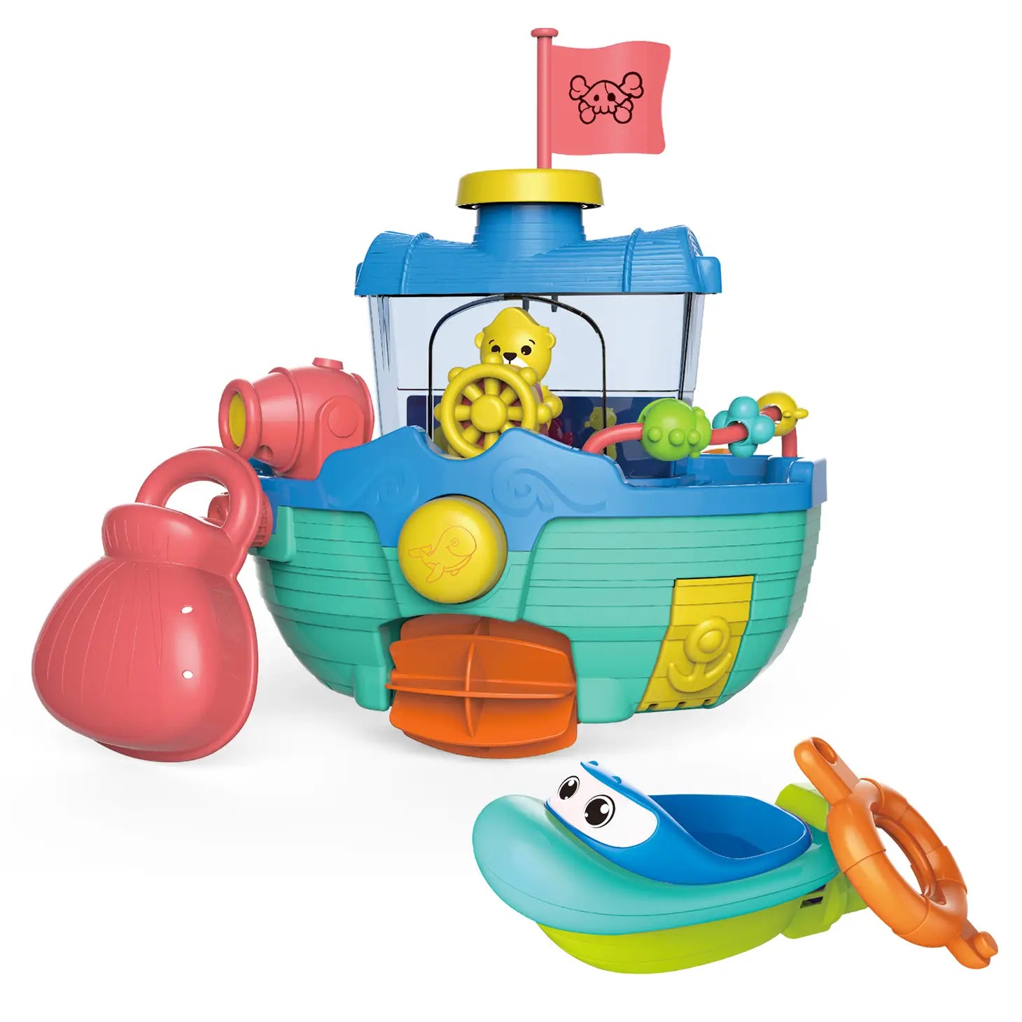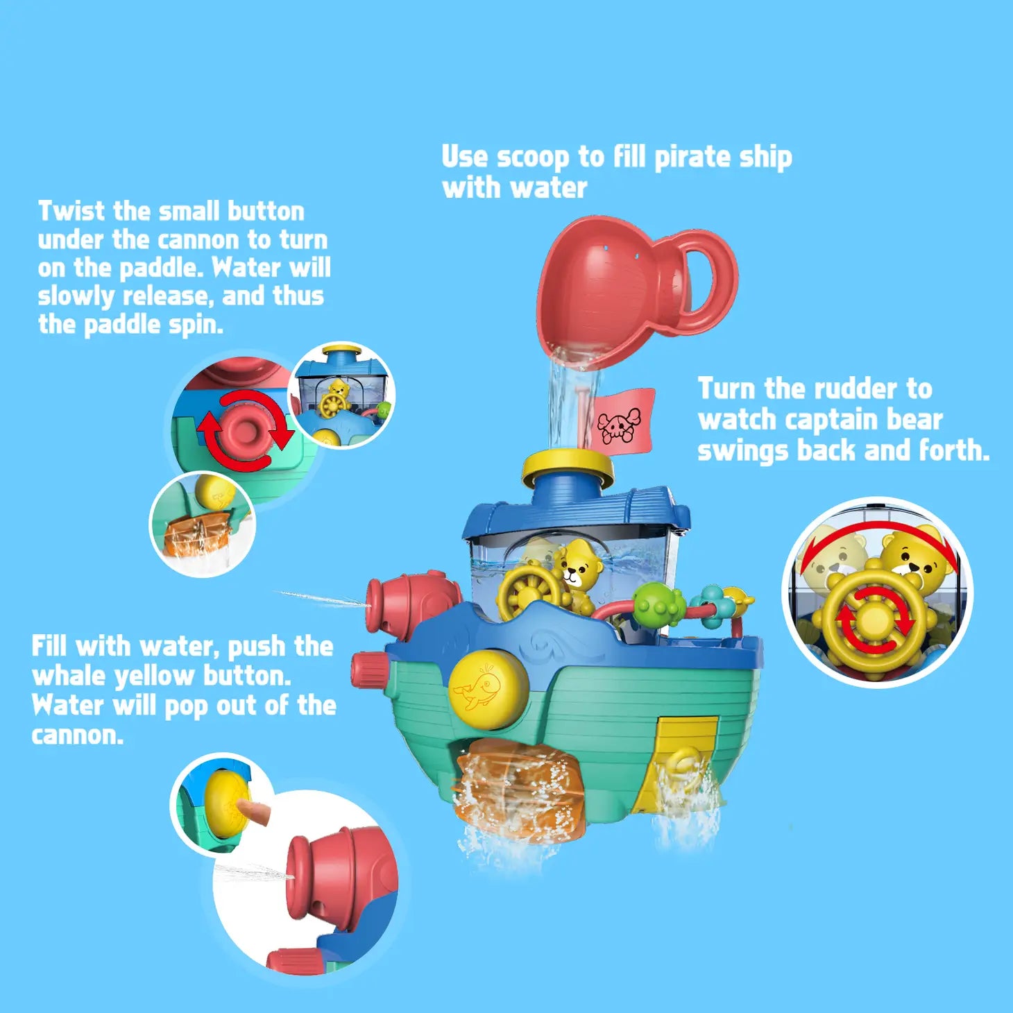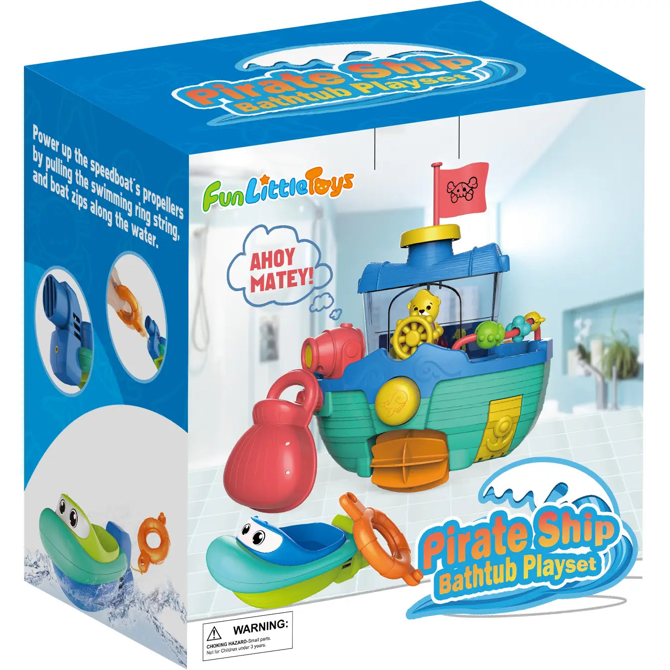 A wall-mountable pirate ship bath toy & pull string speedboat helps make bath time more fun for toddlers The pirate ship bathtub toy comes with a pirate flag, paddle, moveable rudder, and water cannon, and a shell-shape water scoop for a splashing fun in the tub; it attaches easily to your bath tiles with strong suction pads Use a scoop to fill the main hull with water, push the whale pattern button, and water will pop out of the cannon; or turn the rudder to watch captain bear swings back and forth Power up the propeller of the speedboat by pulling the swim ring string, the pull-and-go toy boat will zip along the water; no batteries are needed Crafted from 100% recycled plastic, made without PVC or phthalates;