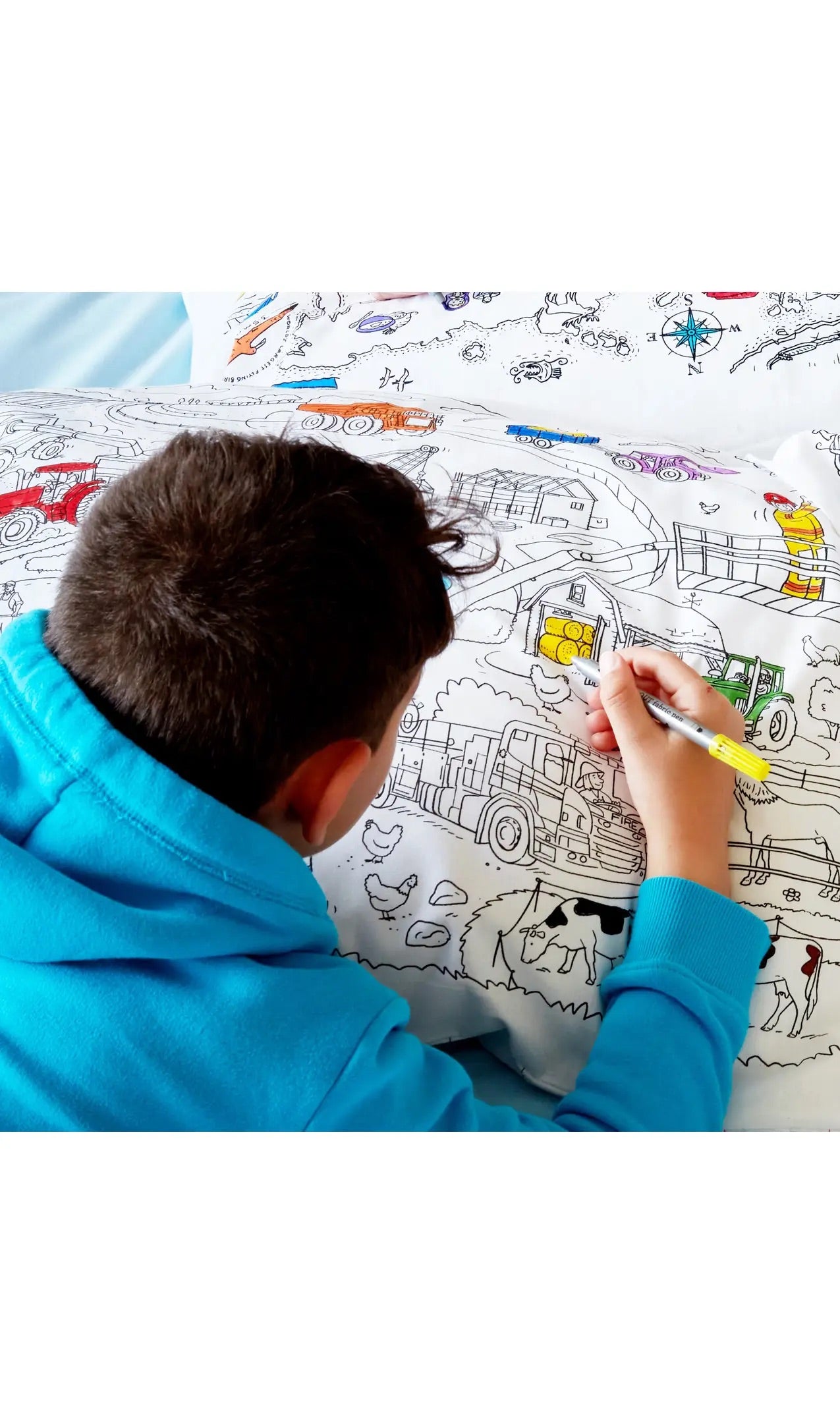 Learn about things that go as you colour our fun colour-in pure cotton pillowcase packed with diggers, buses, sports cars and more! Kids can enjoy learning about the history of the wheel and cars – with space to design their own vehicle on the reverse. Complete with a set of 10 wash-out felt tip pens – simply pop the pillowcase in the wash and begin a new colouring journey.